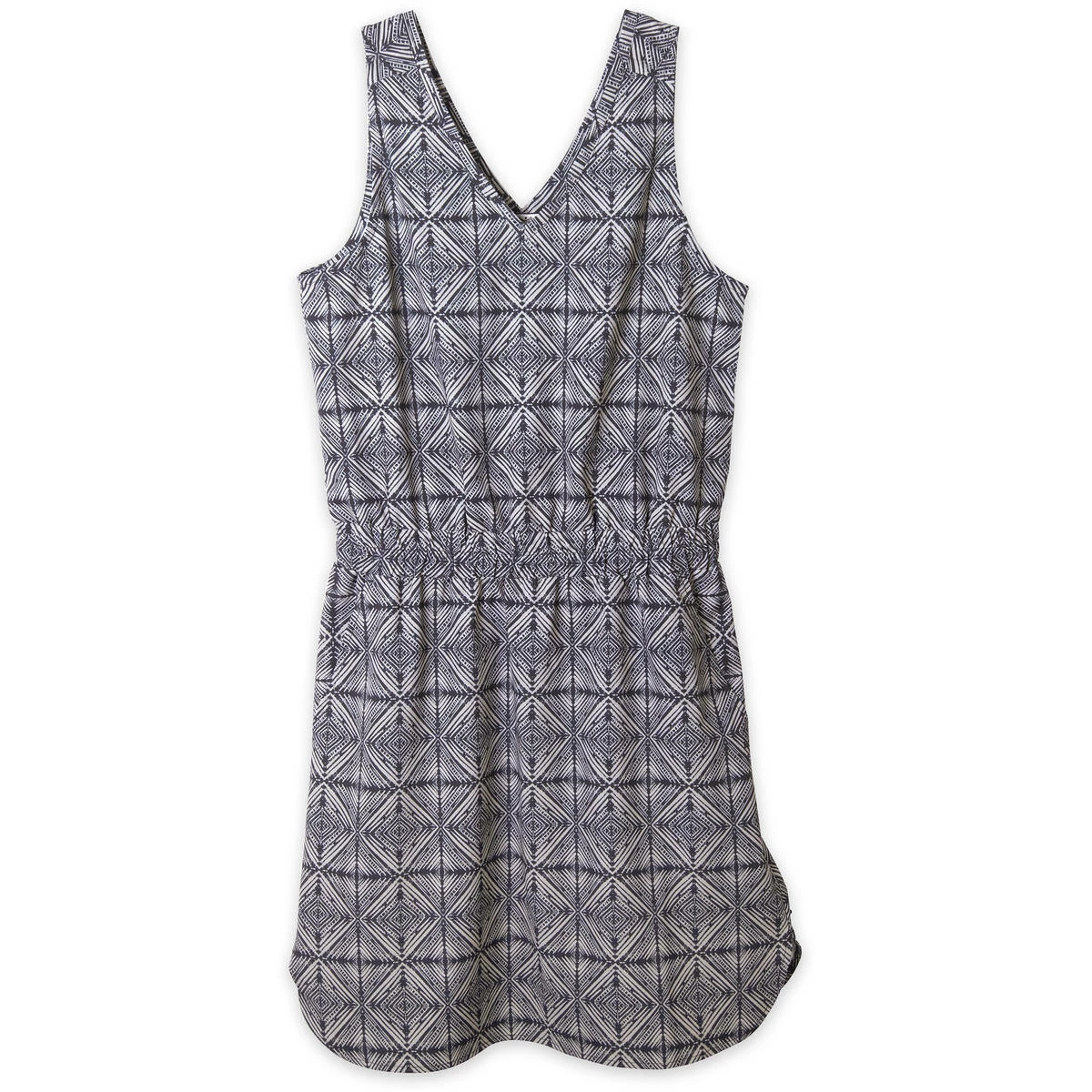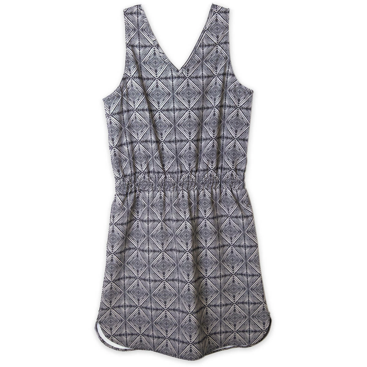 Semi-fitted sleeveless dress, elastic waist, v-neckline, front pockets, curved hem, length hits mid-thigh.