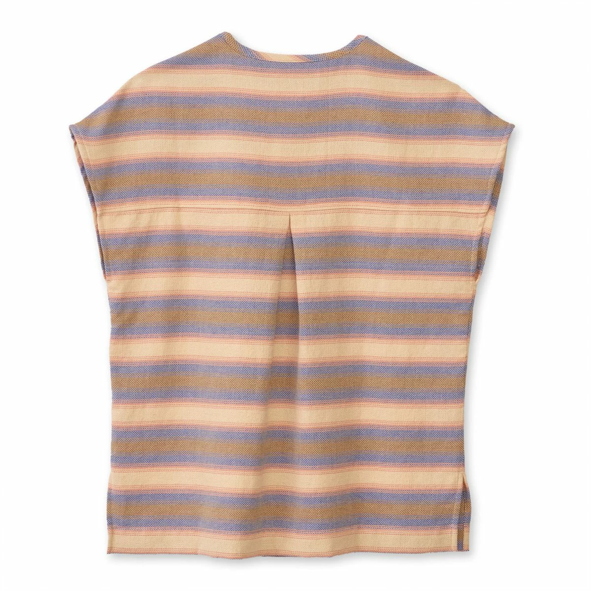 Relaxed fit, sleeveless popover shirt, v-neckline, front and back pleat detail, straight hem with side slits.